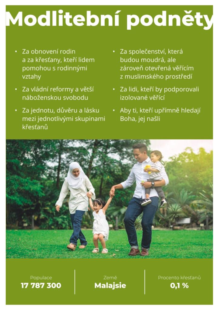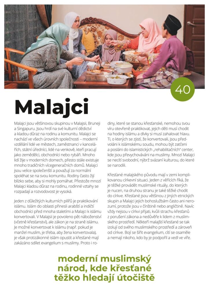 Jsou hrdí na své kulturní dědictví, kladou důraz na rodinu a komunitu. Malajci konvertovali před mnoha stoletími k islámu a dodnes je jedním z kulturních pilířů. V Malajsii je povoleno 5 náboženství, včetně křesťanství. Ale je protizákonné islám opustit a křesťané mají zakázáno s muslimy sdílet evangelium.