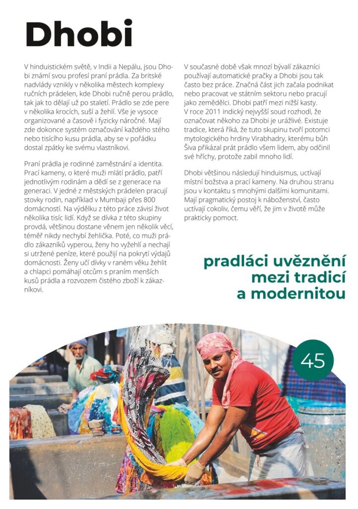 Dhobi jsou v Indii a Nepálu známí svou profesí praní prádla. Dělají to už po staletí stejným způsobem. Je to rodinné zaměstnání a identita a dědí se z generace na generaci. Nyní však již řada z nich o práci přichází a hledají nové možnosti uplatnění. Následují hinduismus, místní božstva a také prací kameny.