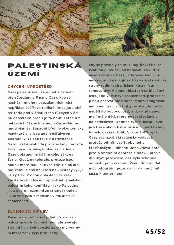 Mezi palestinská území patří Západní břeh Jordánu a Pásmo Gazy, kde se nachází mnoho novozákonních míst, například Ježíšovo rodiště.