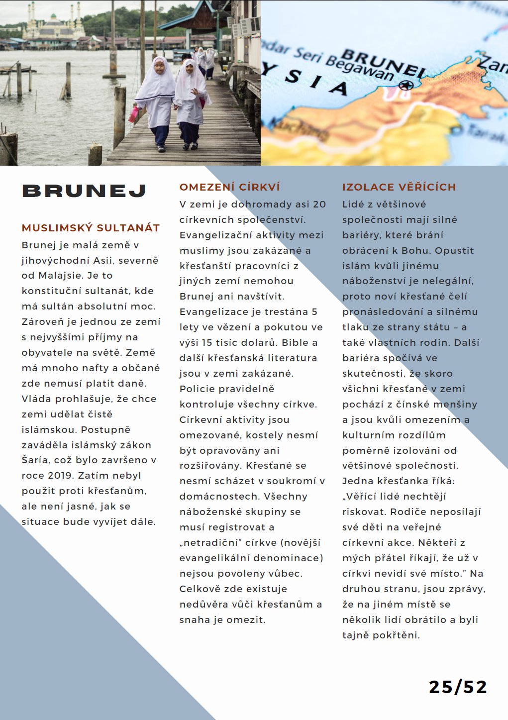 Evangelizační aktivity mezi muslimy jsou zakázané a křesťanští pracovníci jiných zemí nemohou Brunej ani navštívit.